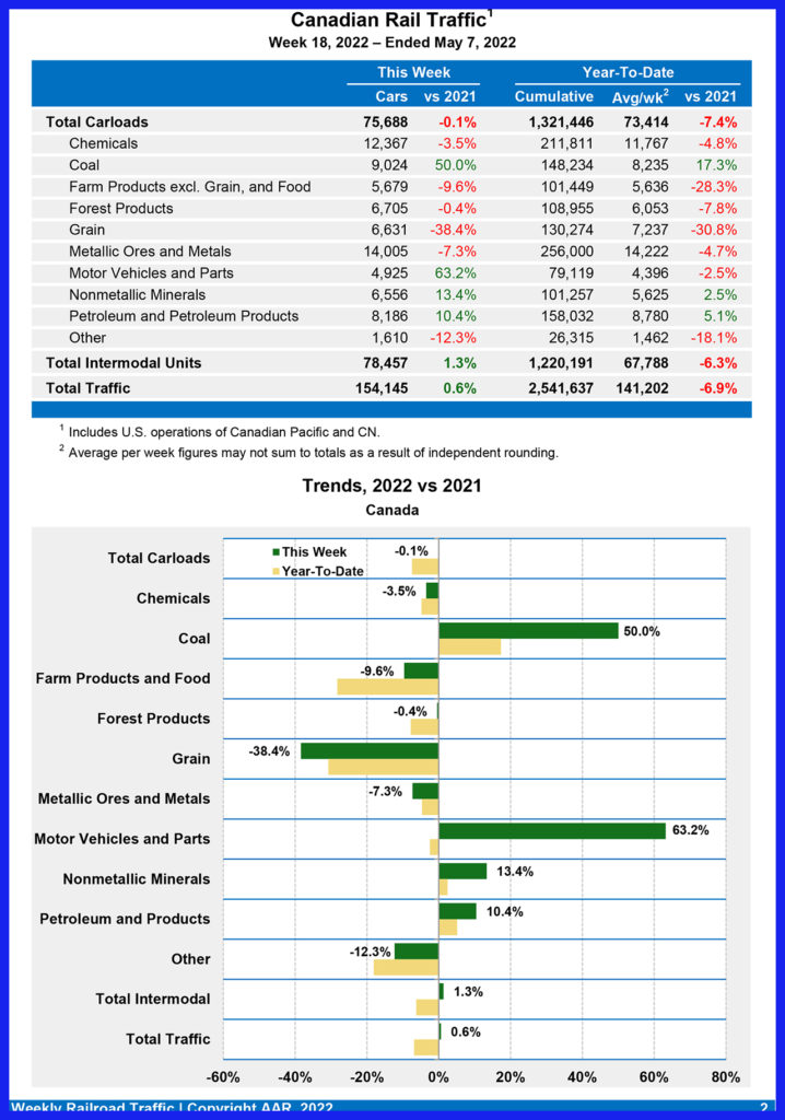 Canadian railroads reported 75,688 carloads for the week, down 0.1%, and 78,457 intermodal units, up 1.3% compared with the same week in 2021. For the first 18 weeks of 2022, Canadian railroads reported cumulative rail traffic volume of 2,541,637 carloads, containers and trailers, down 6.9%.