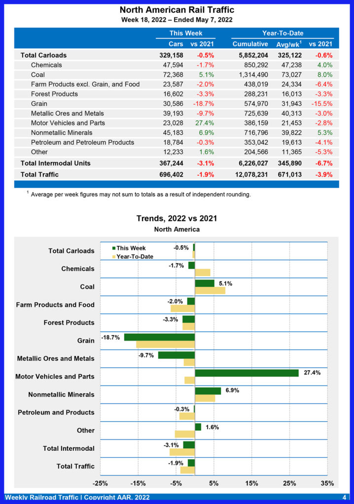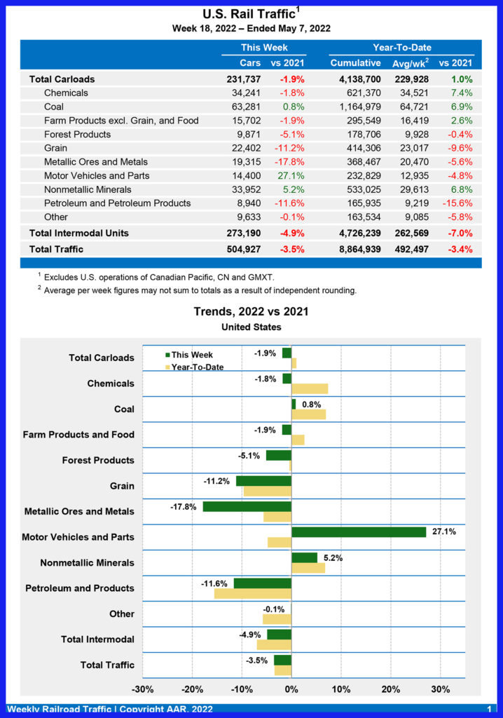 For the first 18 weeks of 2022, U.S. railroads reported cumulative volume of 4,138,700 carloads, up 1% from the same point last year; and 4,726,239 intermodal units, down 7% from last year. Total combined U.S. traffic for the first 18 weeks of 2022 was 8,864,939 carloads and intermodal units, a decrease of 3.4% compared to last year.