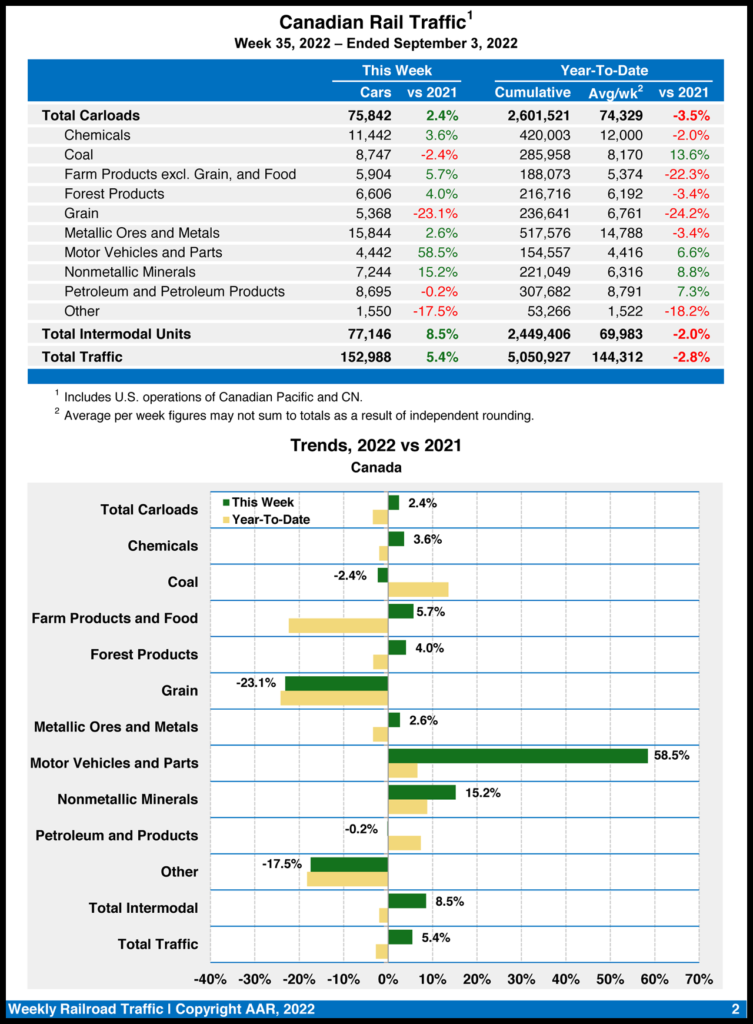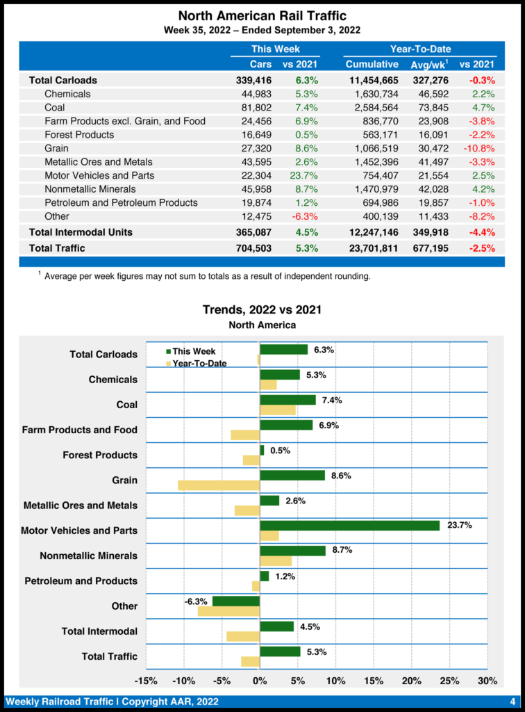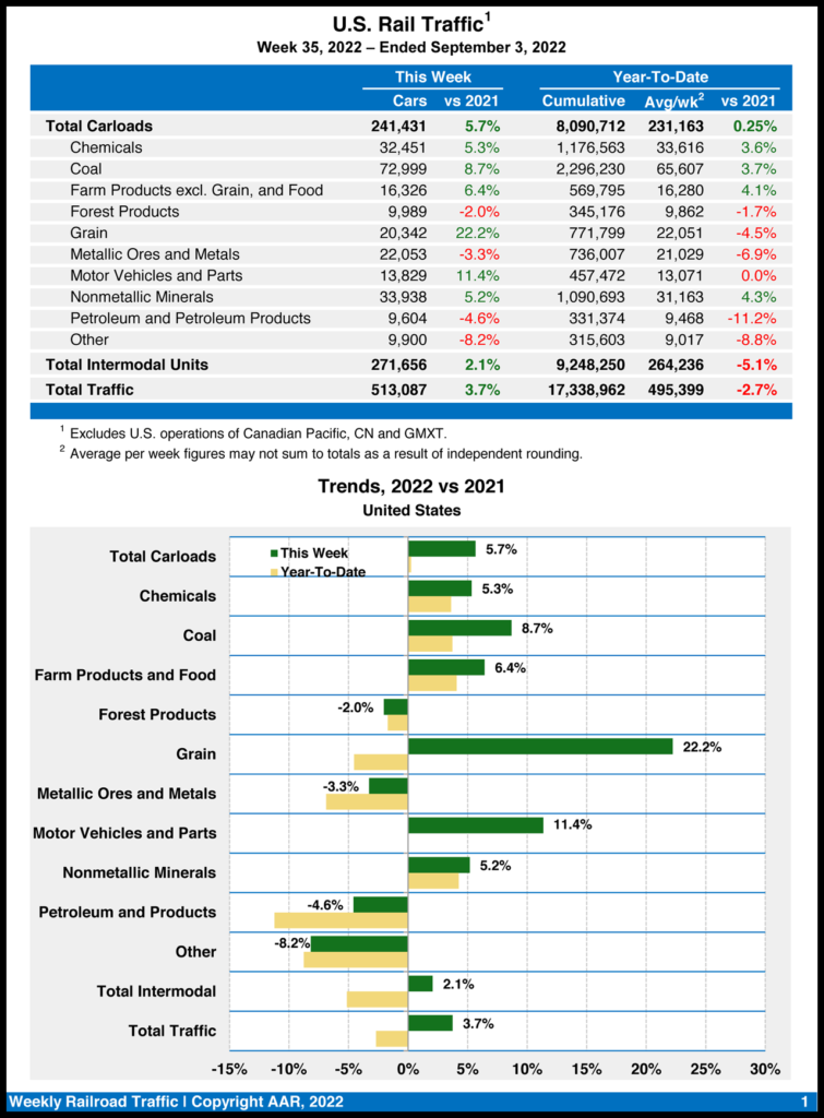 Total combined U.S. traffic for the first 35 weeks of 2022 was 17,338,962 carloads and intermodal units, a 2.7% drop from the year-ago period.