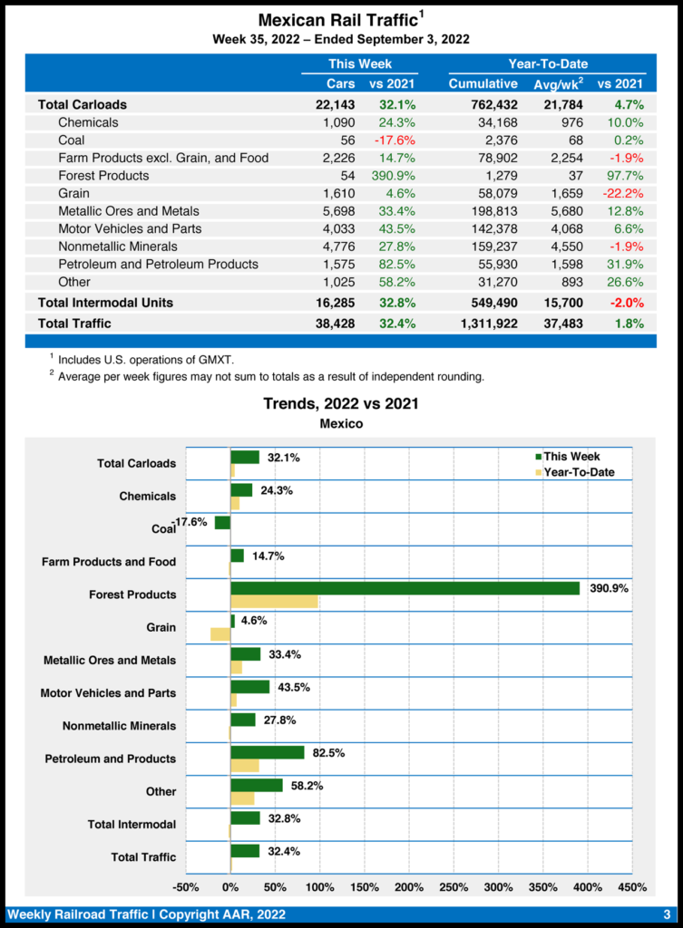 Mexican railroads reported 22,143 carloads for the week, a 32.1% boost over the same week last year, and 16,285 intermodal units, a 32.8% gain. Their cumulative volume for the first 35 weeks of 2022 reached 1,311,922 carloads and intermodal containers and trailers, increasing 1.8% from the same point in 2021.