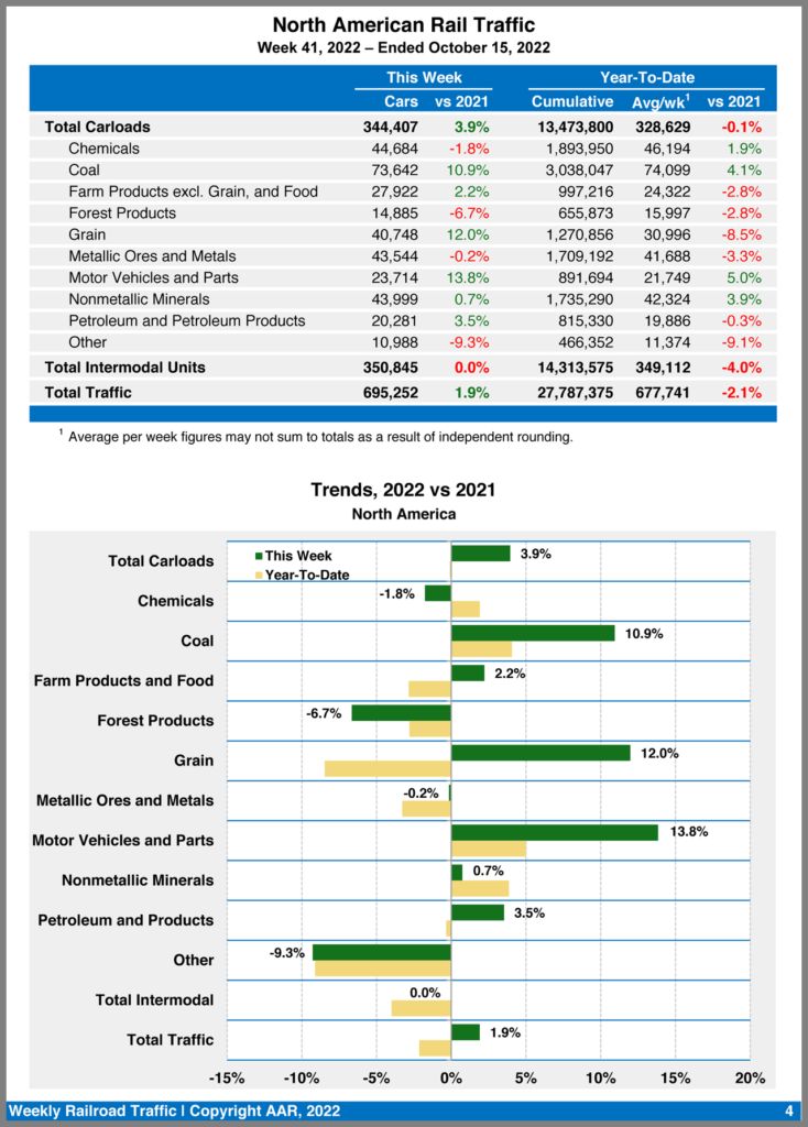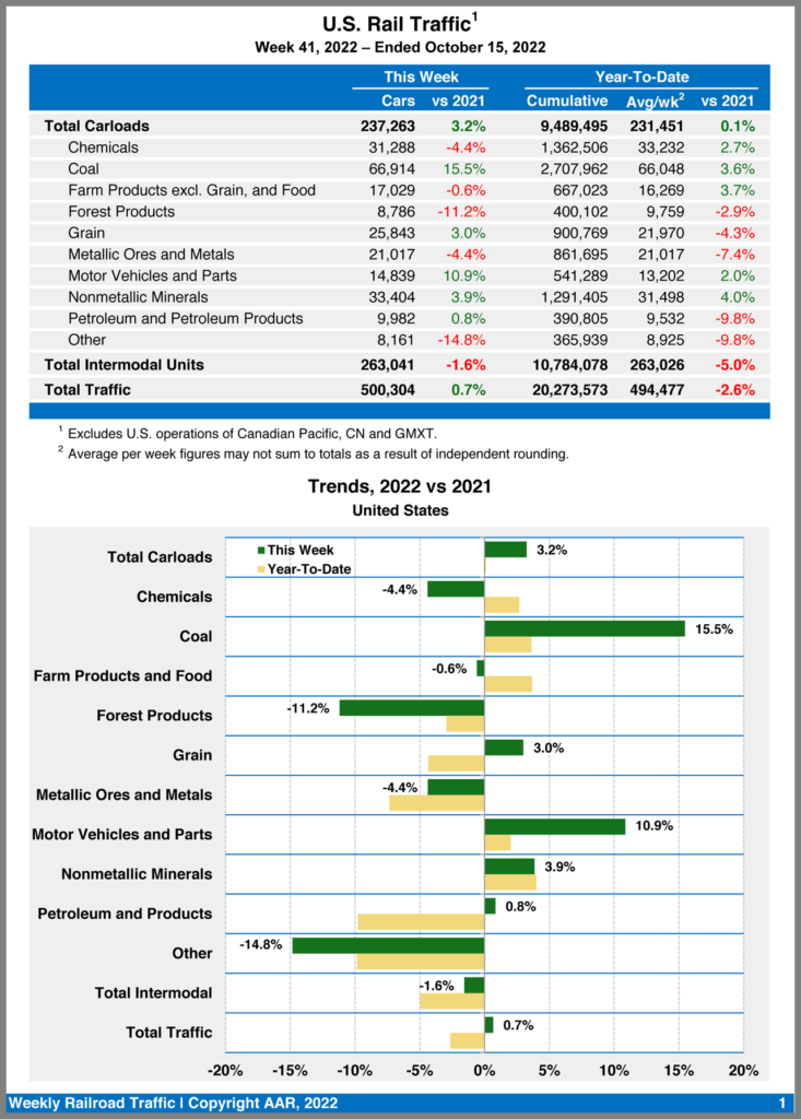 In Week 41 (ending Oct. 15, 2022), U.S. Class I railroads hauled a total of 500,304 carloads and intermodal units, comprising 237,263 carloads and 263,041 containers and trailers. This is the first time since Week 35 (ending Sept. 3, 2022) that a gain in total rail traffic has been reported.