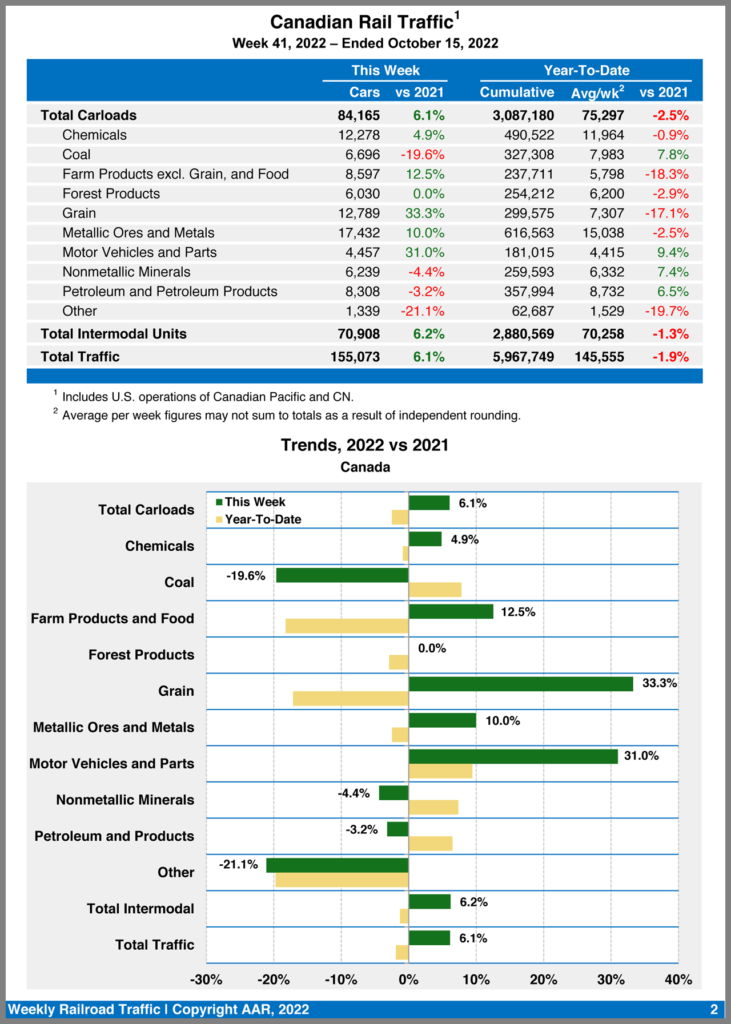 Canadian railroads reported 84,165 carloads for the week, gaining 6.1%, and 70,908 intermodal units, gaining 6.2% from the same week in 2021. For the first 41 weeks of 2022, they reported cumulative rail traffic volume of 5,967,749 carloads, containers and trailers, down 1.9% from the prior-year period.