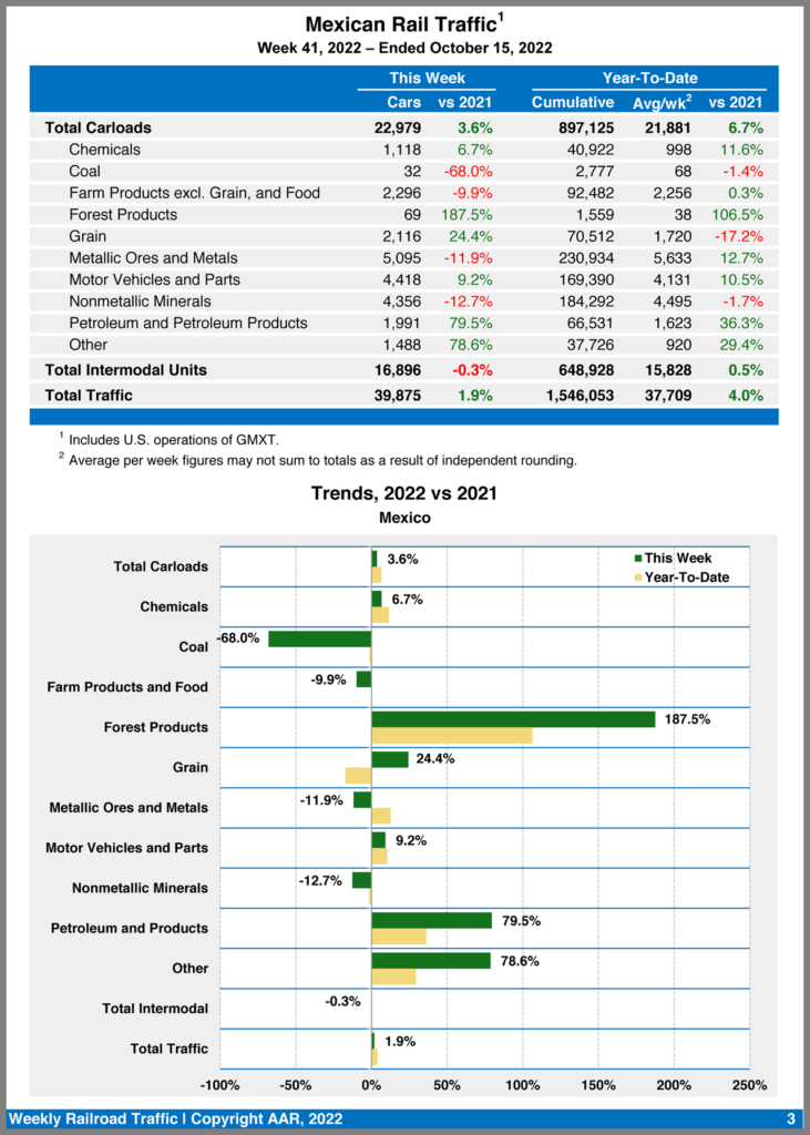 Mexican railroads reported 22,979 carloads for the week, up 3.6% from same week in 2021, and 16,896 intermodal units, down 0.3%. Their cumulative volume for the first 41 weeks of 2022 was 1,546,053 carloads and intermodal containers and trailers, rising 4% from the same period last year.