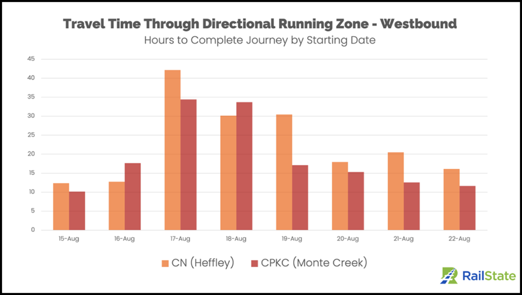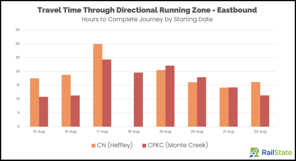 According to RailState, eastbound travel times did not increase as much as westbound travel times. The company said this is likely due to trains being held closer to Vancouver before entering the DRZ.