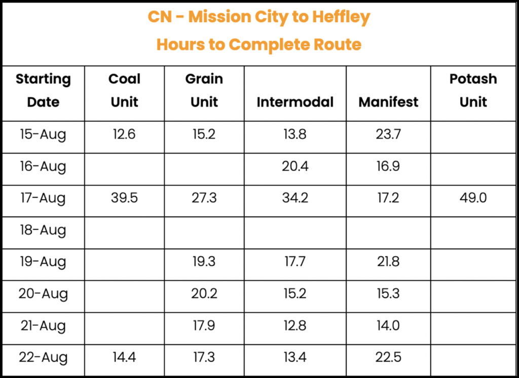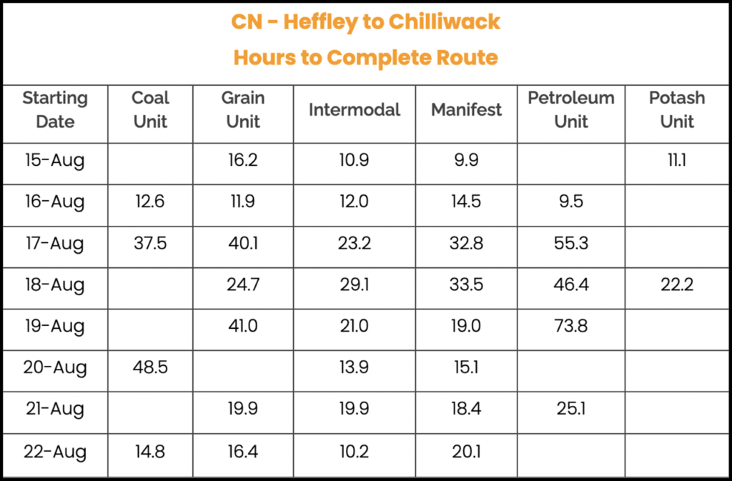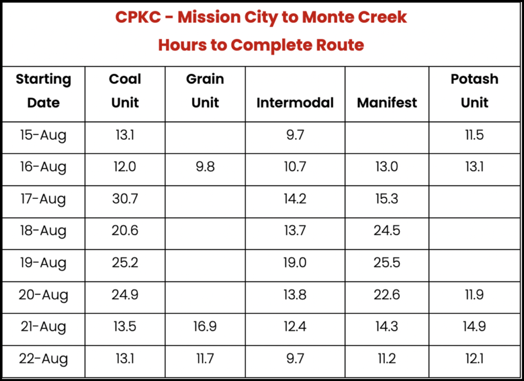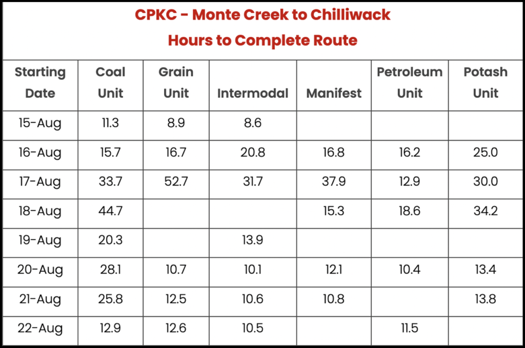 Travel through the DRZ from Heffley (CN) and Monte Creek (CPKC) to Chilliwack typically takes less than a day, according to RailState. The time more than doubled as a result of the Aug. 18 shutdown.