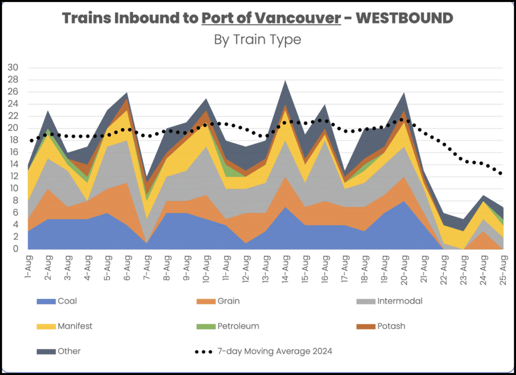 The Port of Vancouver typically sees 20 trains per day, according to RailState, but on Aug. 25, it only saw seven: two intermodal, two manifest, one rank car unit (petroleum), and two other trains. There were no coal, grain or potash trains.
