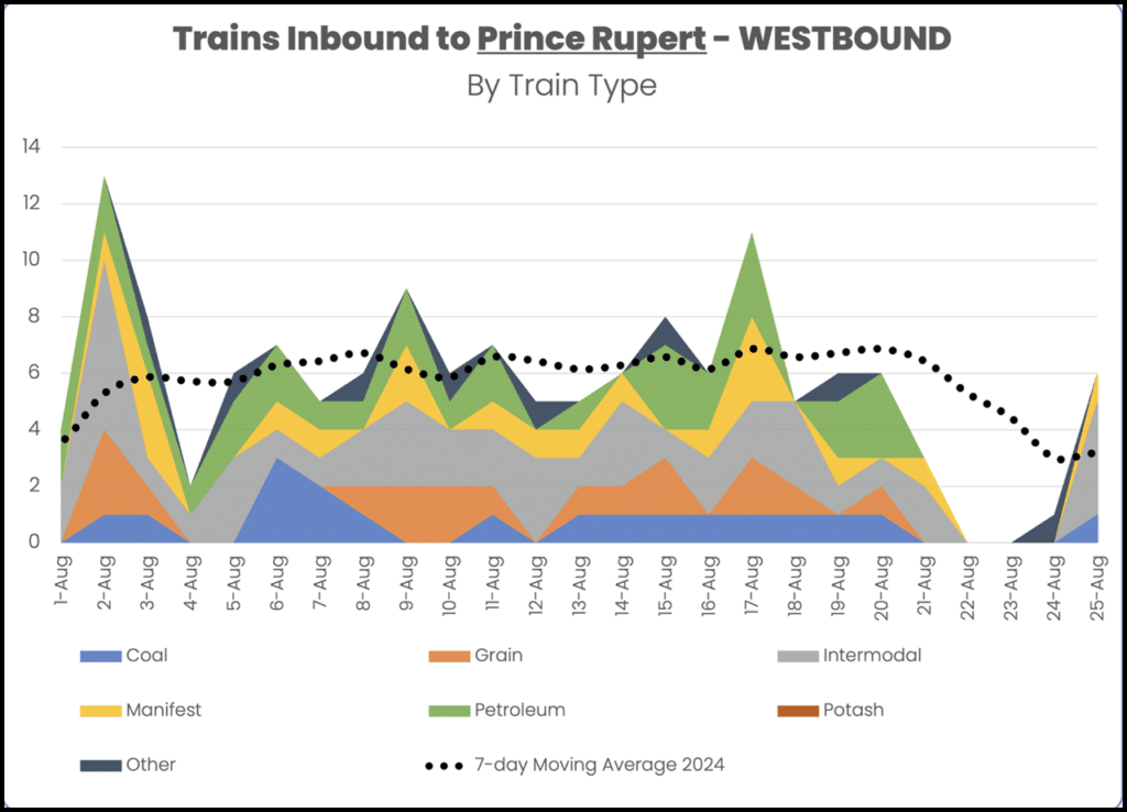 RailState reported that the Port of Prince Rupert saw no freight volume Aug. 22-24 (there was one passenger train Aug. 24), and volume returned on Aug. 25, with mostly intermodal trains coming to the port to pick up containers. The Port’s Aug. 25 volume included one coal, four intermodal and one manifest train; there were no grain, tank car unit (petroleum) or other trains, according to RailState.