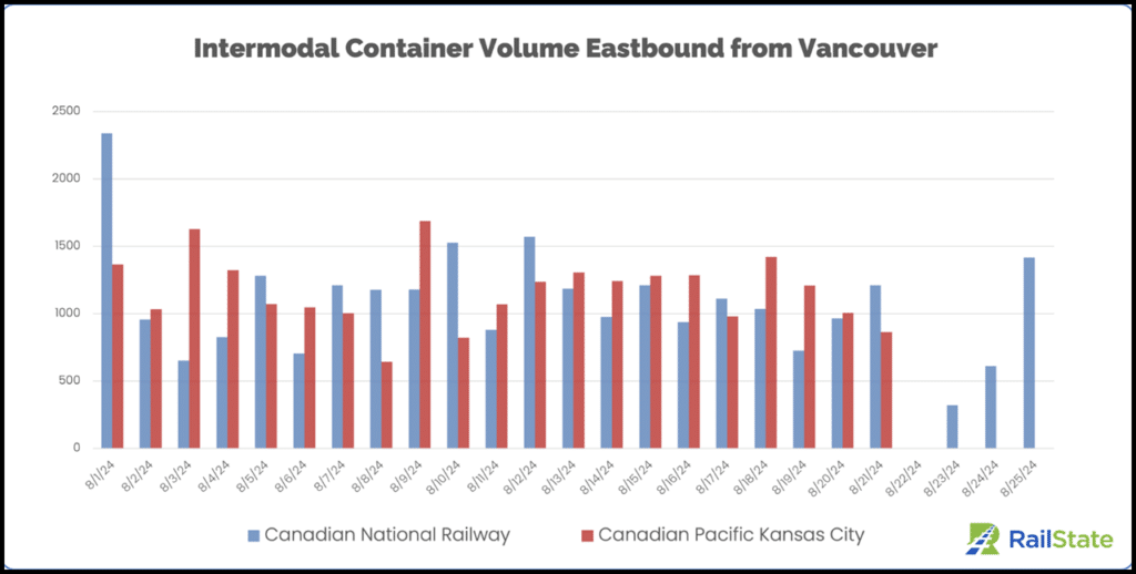 “New container volume from the Port of Vancouver stopped on the first day of the work stoppage [Aug. 22] and some activity returned on Friday [Aug. 23] on CN,” RailState reported. “On Sunday [Aug. 24], CN moved container volume in-line with their recent daily averages. CPKC has not moved container volume out of the Port of Vancouver from Aug 22-25.”