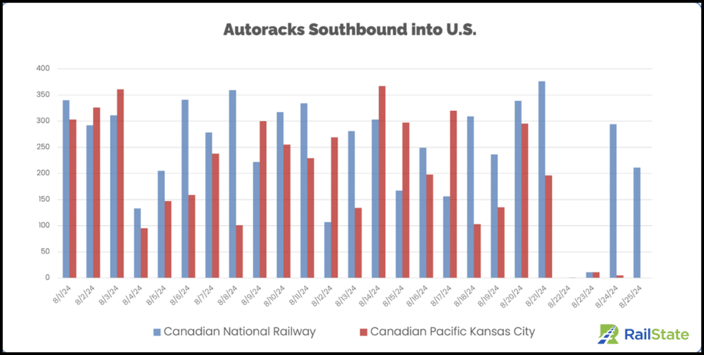 “Automakers in Canada are particularly reliant on rail to move vehicles to the United States, mostly to the Midwest,” RailState noted. “The flow of autoracks southbound across the border stopped on Aug. 22 and no real volume returned until Saturday [Aug. 24] on CN. Cross-border autorack movements on CPKC have not restarted through Aug. 25.”