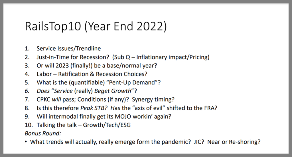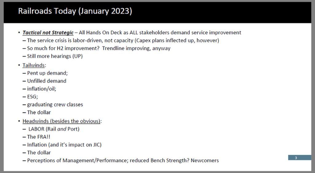 Independent rail industry analyst Tony Hatch gave his usual whirlwind but accurate presentation of the industry today, commenting on how it is “still talking the talk.” As always, he outlined the industry’s good and bad situations of the past year, and wrapped it up with a positive outlook.