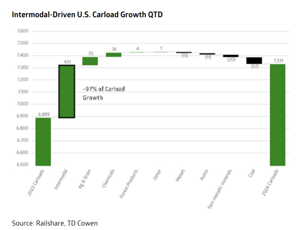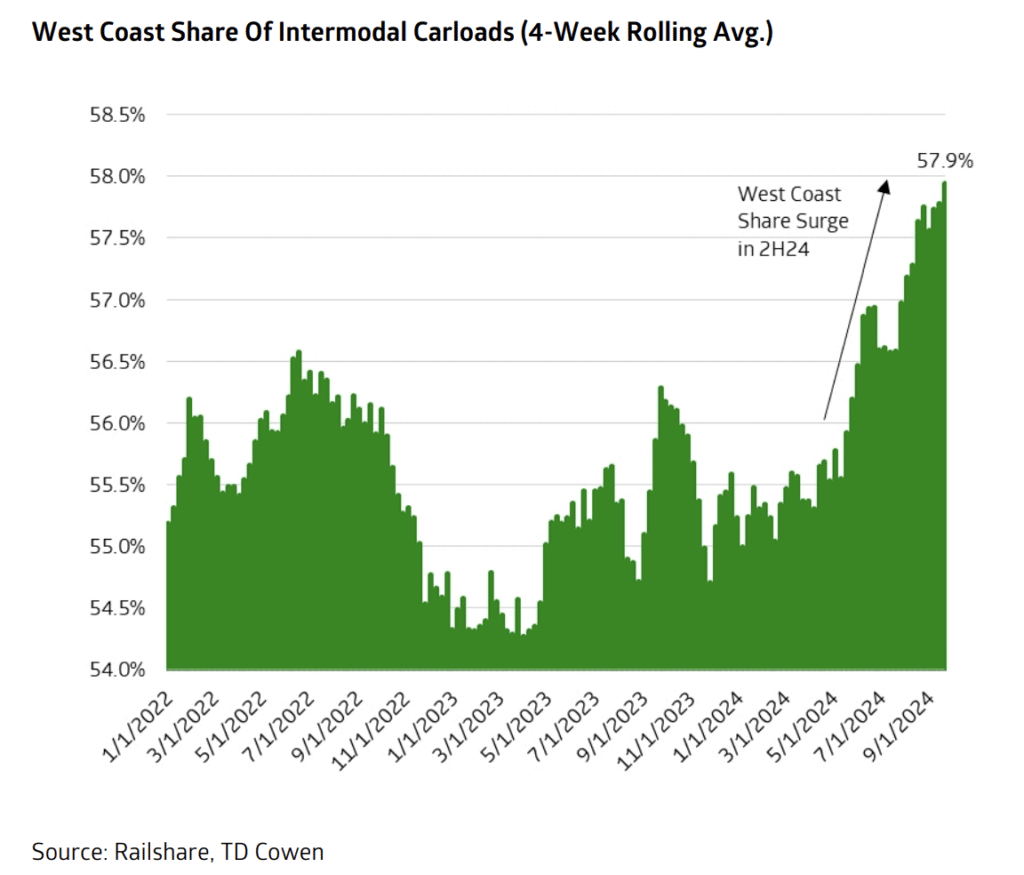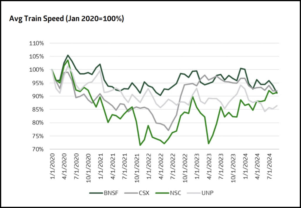 Notwithstanding impacts of the recent hurricane, we believe rail service has remained relatively steady in the third quarter and still materially improved over 2023 levels. Average train speed at UP saw modest improvements amid a considerable intermodal volume surge, in line with commentary we heard from the Port of Los Angeles citing smooth operations and box turns at rail yards. Recovery from weather events in the second quarter proved swift at UP and we will monitor developments on the Eastern network out of Helene.