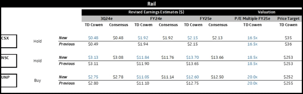 We caught up with all the U.S. rails ahead of quiet period: we favor NS over CSX into the print given cost initiatives at NS that appear to be on track (not including Hurricane Helene impacts) and volume growth tracking well above our previous estimates (+2.9% QTD for CSX and +7.5% for NS). CSX and NS were both impacted by the hurricane last week; CSX and NS both experienced a damaged network that caused delays, impacted service, and added costs. It will likely negatively impact the final days of the third quarter and bleed into the final quarter of the year.