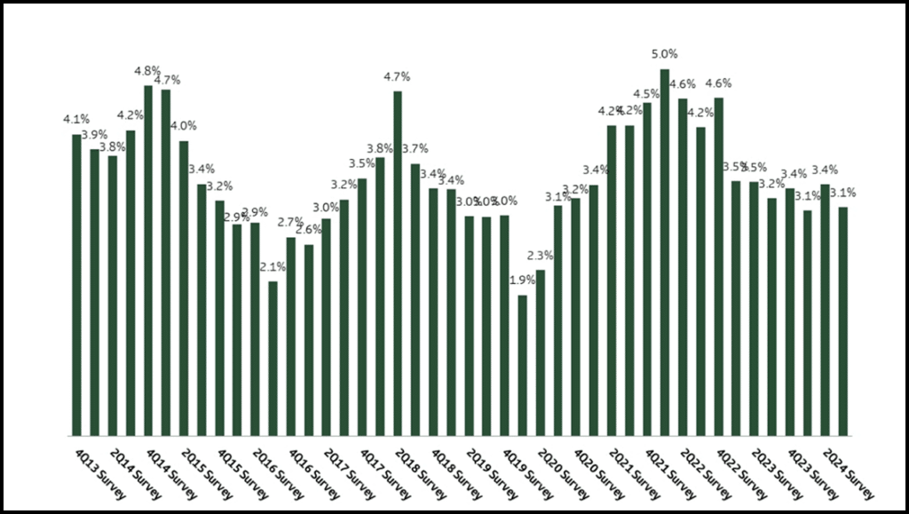We asked shippers if they had pulled forward peak season freight due to numerous uncertainties (port strike, tariffs, Red Sea) and 28% of participants told us they had done so. At the same time, approximately 26% of shippers believe restocking has already intensified (a bullish longer-term signal). Additionally, about half of participants expect shipments to remain in warehouses for less than a month, similar to last quarter, implying robust restocking demand. Results indicate to us both pull forward and traditional peak factors are drivers of the ongoing surge in imports and intermodal volumes. In our view, this suggests volume strength can continue into the fourth quarter and lines up with commentary we heard on our State of the Ports call from the head of the Port of Los Angeles pointing to a robust October. 2025 volume outlook remains fairly muted given unknowns for industrial production, consumer spending, housing demand, a sentiment that was reiterated by Class I railroads at the NEARS conference we recently attended and pegged to UP’s LT financial outlook