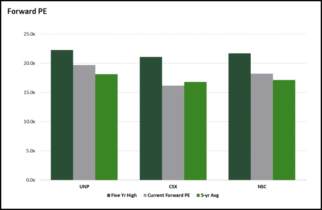 Both UP and NS are trading above their forward five-year PE averages, while CSX is currently trading at approximately a half turn discount to its historical average. All three U.S. Class Is are trading well below their five-year highs. NS is the best U.S. performer year-to-date, though the rails have underperformed the TL group, LTL group, and the broader market this year. We are increasingly cautious on near-term mix/yield challenges for the U.S. group that may limit upside given strength in volumes QTD. Rail pricing survey outlook offers negative yield read in the second half.