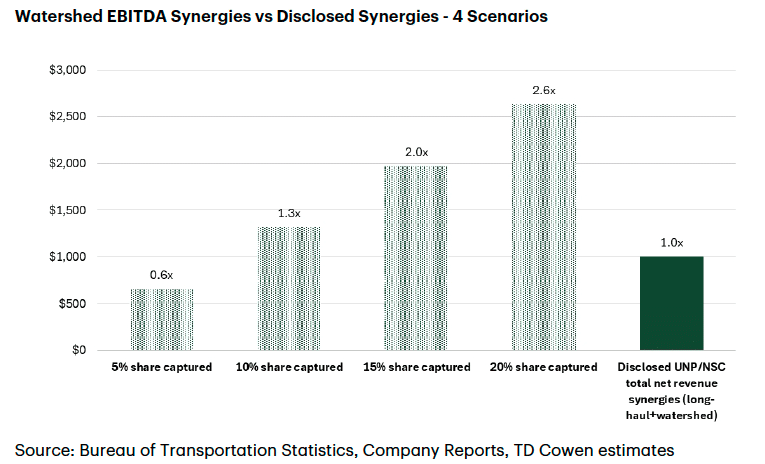 We believe a transcon faces significant conversion TAM but outcomes hinge on execution, which will occur over a multi-year period. The fmr Class I CEO we hosted recently highlighted the opportunity to strike contracts with customers (auto mainly) for ~75%-80% of their volumes (full note here). Such outcomes likely represent the upside scenario given that our 10% capture assumption yields outsized EBITDA gains. The chart below visualizes the watershed EBITDA opportunity in various share capture scenarios relative to UNP’s disclosed total synergy estimate.