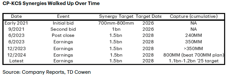 We believe a unified UNP/NSC sees potential upside to disclosed revenue synergies as we quantify the watershed opportunity. As such, we expect synergy estimates to be walked up over time (as observed in the CP-KCS merger detailed in table below). Our recently published deep-dive analysis of over 4,000 watershed O-D pairs suggests that even ~10% truck conversion exceeds UNP’s total net synergy target disclosed in a recent S-4 filing (noting that UNP’s estimate includes the larger transcon intermodal piece). Further upside should not be ruled out given rails’ price advantage over truck.