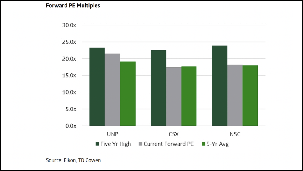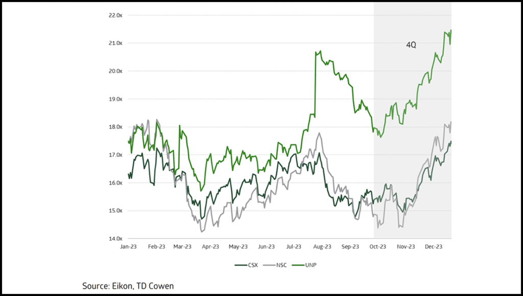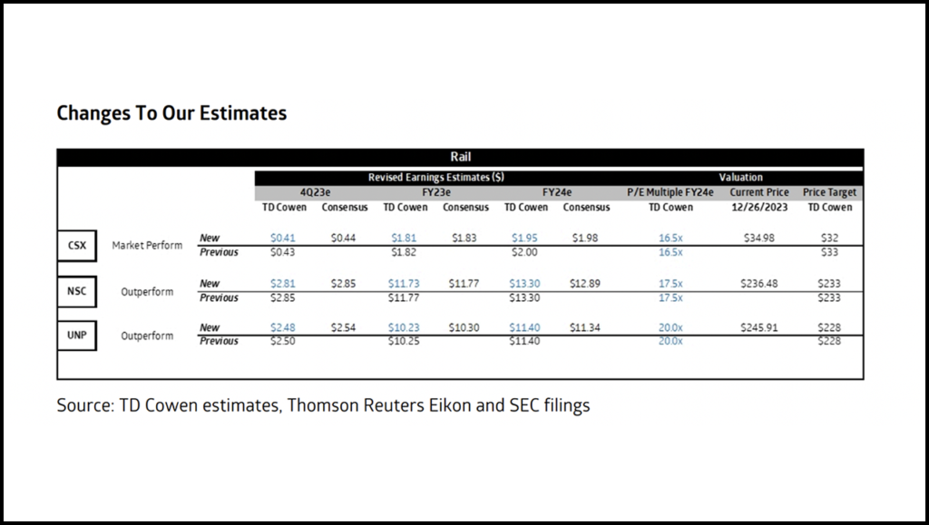 We again leave multiples for the Class I’s intact. We see the railroads’ fortunes dependent on an intermodal rate recovery that is likely a late 2024/early 2025 story, while acknowledging that investor interest in the Class I’s is trending higher as the focus turns to the other side of this freight recession.