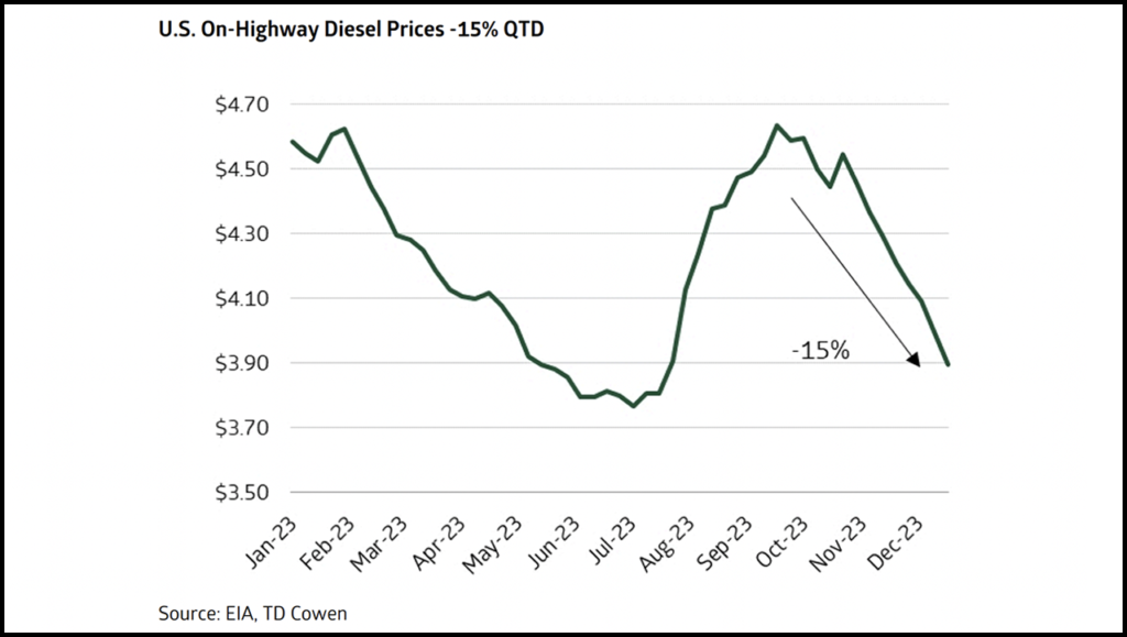 While carloadings continue to track below 2019 levels, the fourth quarter has seen a 1.9% year over year (y/y) increase in quarter-to-date (QTD) volumes driven by a notable 3.4% y/y increase in QTD intermodal volumes. Class I’s have rationalized intermodal pricing to claw back market share in our view as OTR rates continue to bounce along an elongated trough—even showing some unseasonable albeit modest deterioration in the fourth quarter. We continue to expect pressured intermodal pricing through the first half of 2024. Present intermodal volume gains are coming from international business that we note tends to have lower yields, generating some negative mix effects in the quarter.