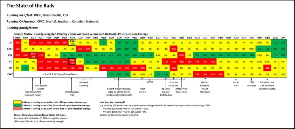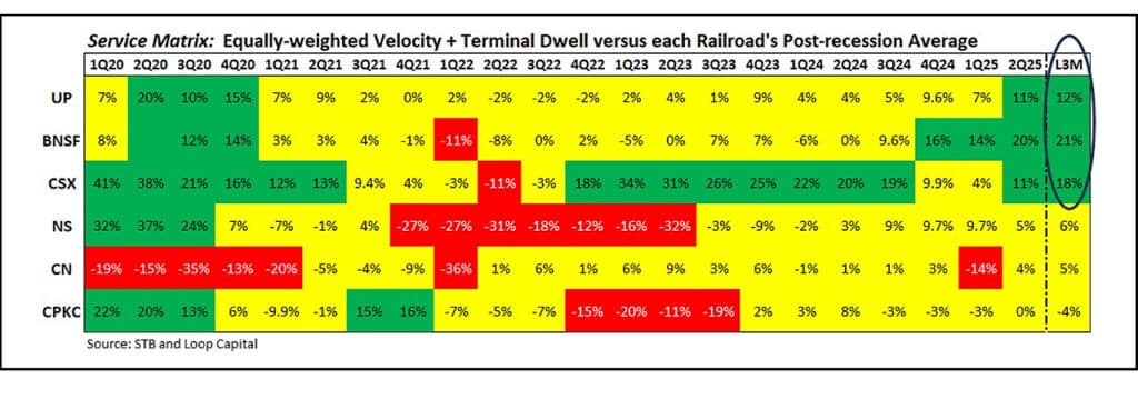 Only CPKC is in negative territory, but we all know why, and it also has the highest bar to clear because it has typically been the best operator. Point being that the industry is in pretty good shape, at least relative to its own operating history. The last time continent-wide Class I operations were this good was in mid-2020, benefiting from pandemic shutdowns that temporarily suppressed volume pressure.
