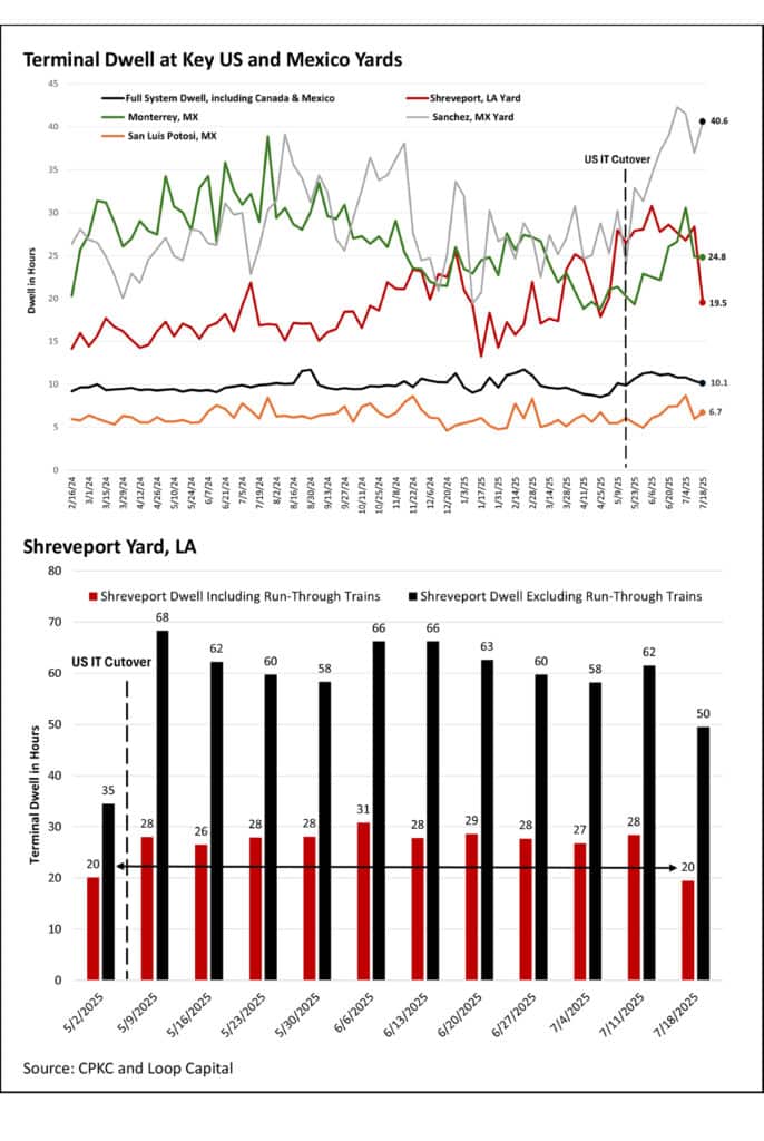 In terms of the key yards we’ve been tracking, you can see in the second chart below that Sanchez in northern Mexico remains a big problem, but there’s good news elsewhere, with recent significant drops in dwell times at Monterrey, San Luis Potosi, and most critically Shreveport in Louisiana, following a two-year high set in the first week of June.