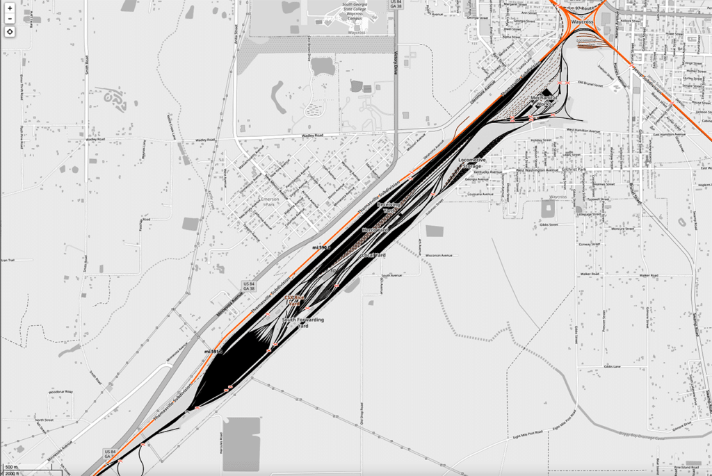The Waycross hump yard is important. Really important. It has the highest throughput of any of CSX’s car yards and every (non-unit-train) car moving to or from Florida must transit through it. It’s the southern “hub,” the single most-critical piece of infrastructure on CSX’s system, and, increasingly, in hurricane alley, taking a direct hit from Hurricane Debby and a glancing blow from Helene more recently.