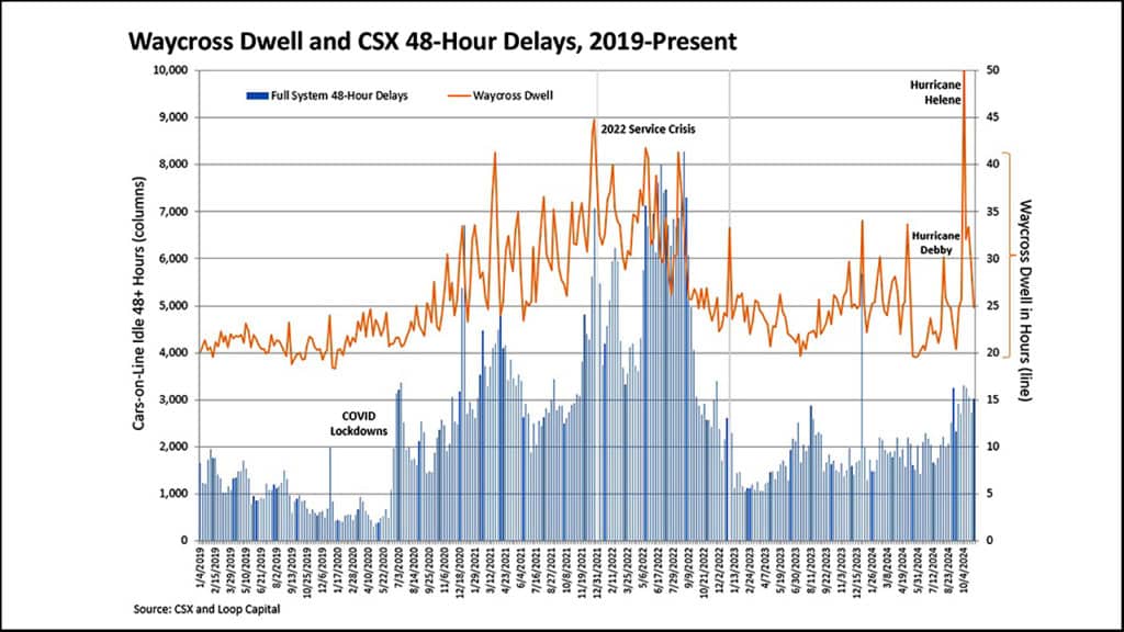 We attended CSX Investor Day 2024 on Nov. 7. There are 25 Wall Street analysts who cover CSX and 24 of them went to hear what CSX’s average annual EPS growth guidance is for the next few years. It’s ~10%, same as the other rails—surprise. CSX was basically telling us to model ~7-8% in 2025 and ~11-12% in 2026 and 2027. We were there because the event included a tour of Rice Yard in Waycross, Ga., and we needed reassurance on an issue that keeps us up at night: the yard’s water drainage systems in the context of network resiliency. We don’t claim to be normal.