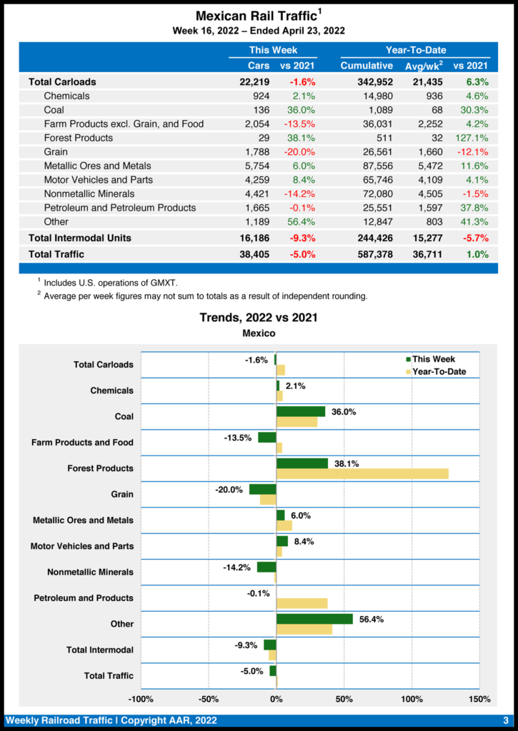 Mexican railroads reported 22,219 carloads for the week, down 1.6%, and 16,186 intermodal units, down 9.3% compared with the same week in 2021. Their cumulative volume for the first 16 weeks of 2022 was 587,378 carloads and intermodal containers and trailers, up 1% from 2021.