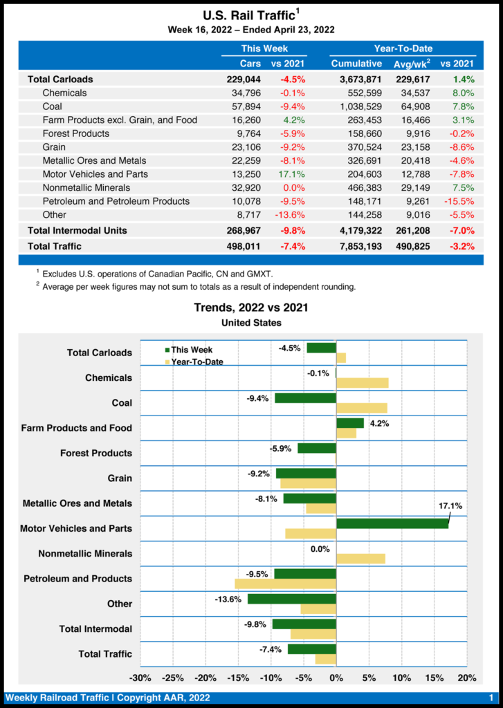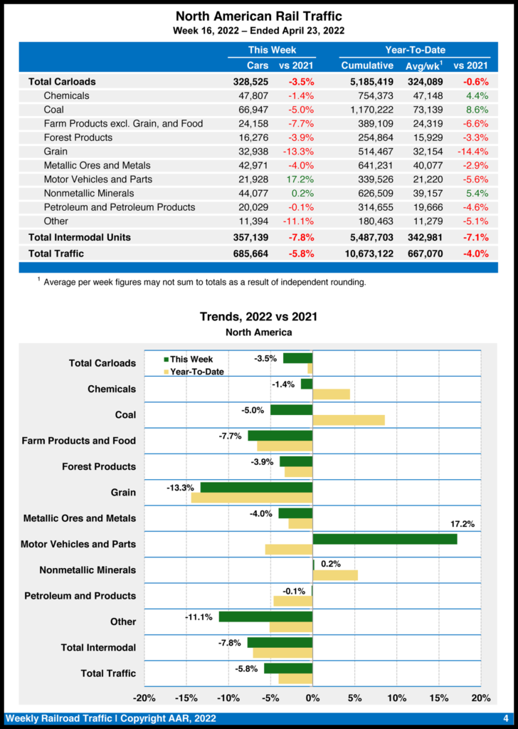 Canadian railroads reported 77,262 carloads for the week, down 1%, and 71,986 intermodal units, up 1% from the same point in 2021. For the first 16 weeks of 2022, they reported cumulative rail traffic volume of 2,232,551 carloads, containers and trailers, an 8% decline.