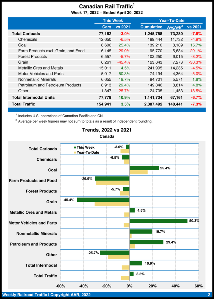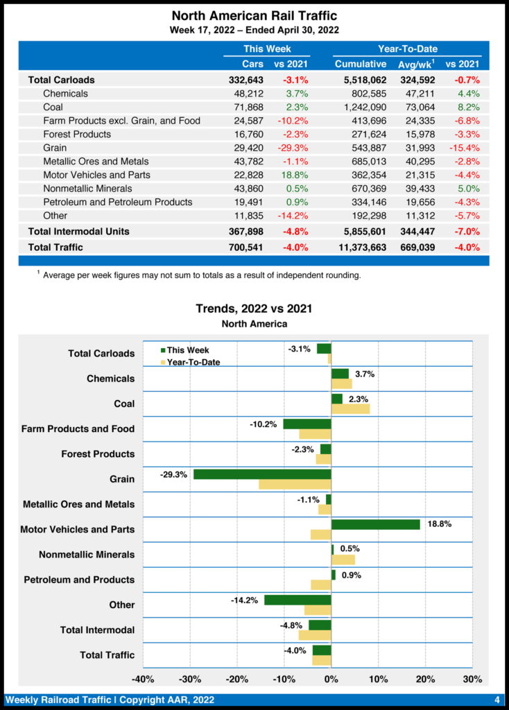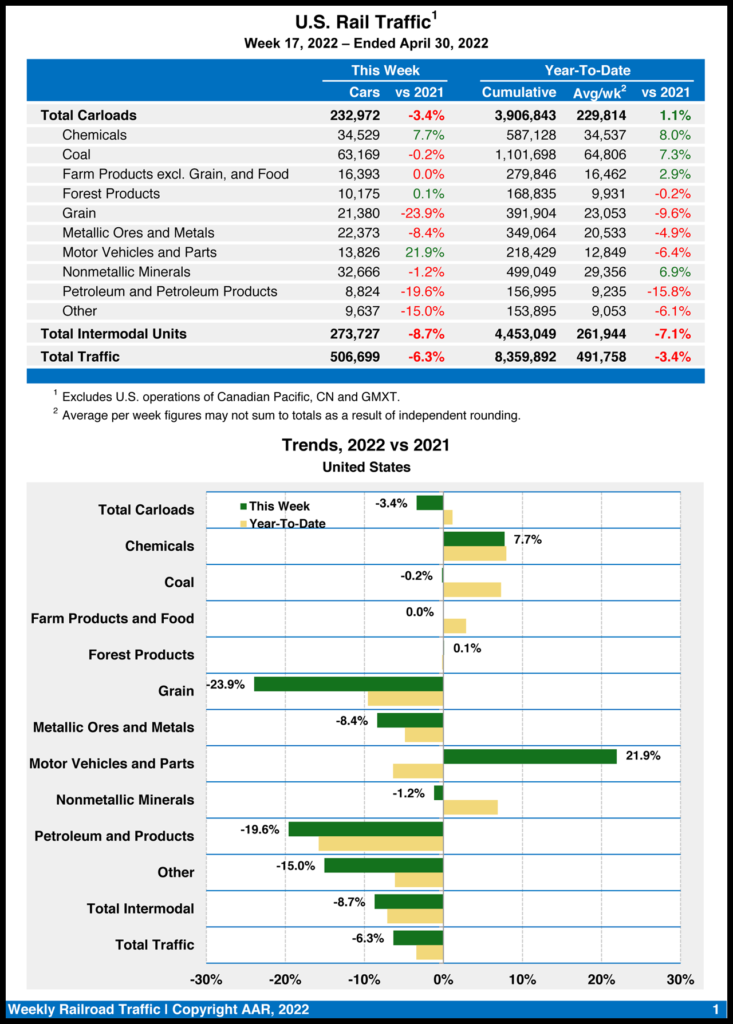 Total combined U.S. traffic for the first 17 weeks of 2022 was 8,359,892 carloads and intermodal units, a 3.4% decline from 2021.