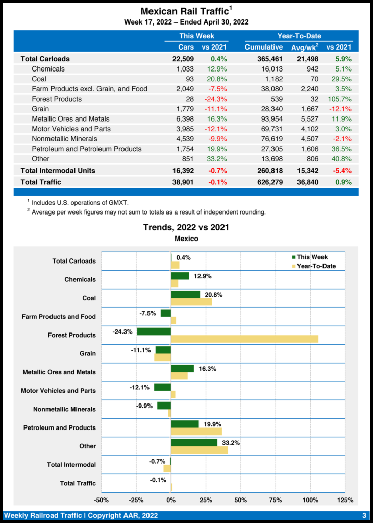 Mexican railroads reported 22,509 carloads for the week, up 0.4% from the same point in 2021, and 16,392 intermodal units, down 0.7%. Their cumulative volume for the first 17 weeks of 2022 was 626,279 carloads and intermodal containers and trailers, up 0.9% from 2021.