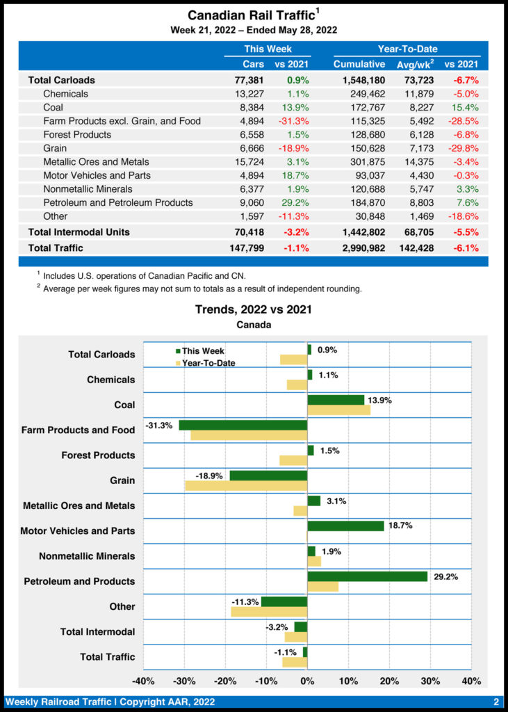 Canadian railroads reported 77,381 carloads for the week, up 0.9%, and 70,418 intermodal units, down 3.2% vs. the same week in 2021. For the first 21 weeks of 2022, they reported cumulative rail traffic volume of 2,990,982 carloads, containers and trailers, down 6.1%.