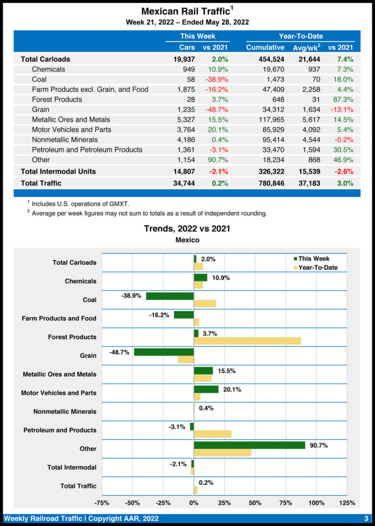 Mexican railroads reported 19,937 carloads for the week, rising 2% from the same week last year, and 14,807 intermodal units, dipping 2.1%. Their cumulative volume for the first 21 weeks of 2022 came in at 780,846 carloads and intermodal containers and trailers, up 3% from the same point in 2021.
