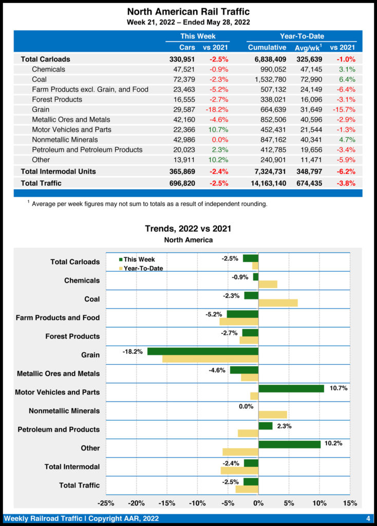 “Auto production and auto carloads seem to be slowly recovering; crushed stone and sand, and food-related volumes are showing strength while intermodal had its best month since June 2021,” Gray noted in the AAR’s rail traffic report for May 2022 and the week ending May 28, 2022. “On the other hand, carloads of chemicals fell for the first time in more than a year in May, while grain volumes continued to be disappointing when compared to those of 2021 and the latter half of 2020.”
