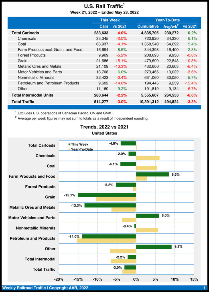 Total carloads for the week ending May 28, 2022, were 233,633 carloads, down 4% from the same week in 2021, while U.S. weekly intermodal volume was 280,644 containers and trailers, down 2.2% from last year.