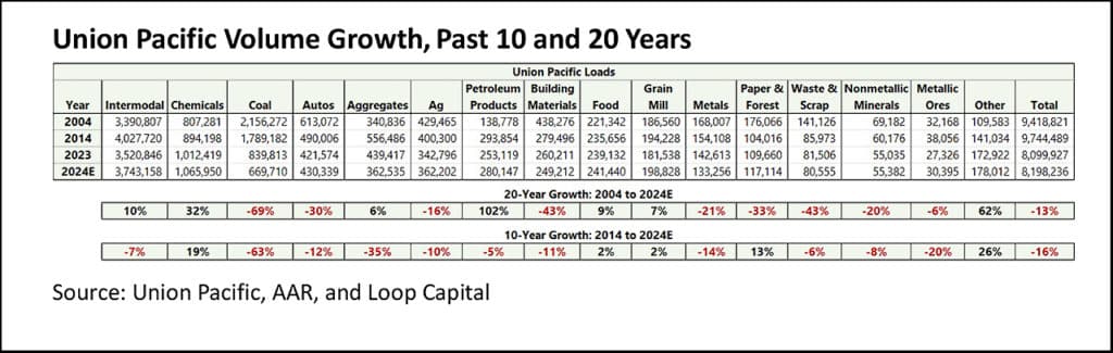 This table shows Union Pacific’s volume growth performance over the past 20 years (2024E vs. 2004, down 13%) and past ten years (2024E vs. 2014, down 16%):