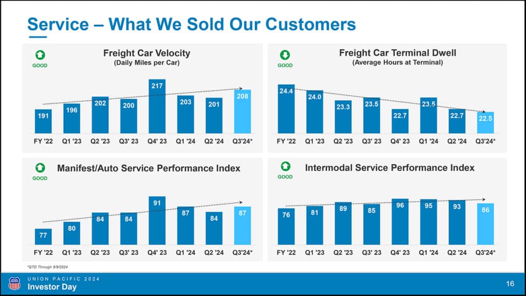 - Service consistency across the full business cycle: Crushingly difficult for a network of UP’s scale and complexity.