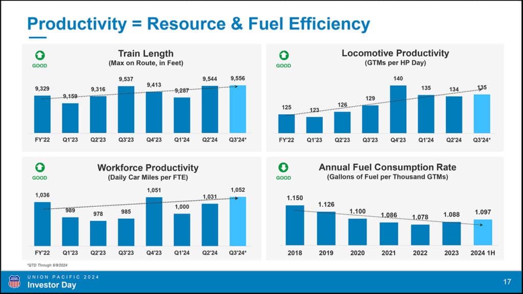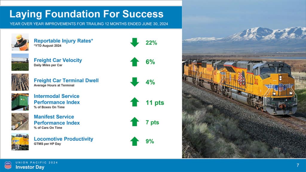Union Pacific held its 2024 Investor Day on Sept. 19. Following are takeaways from analysts at TD Cowen, Susquehanna Financial Group and Loop Capital Markets. UP’s slide presentation can downloaded below.