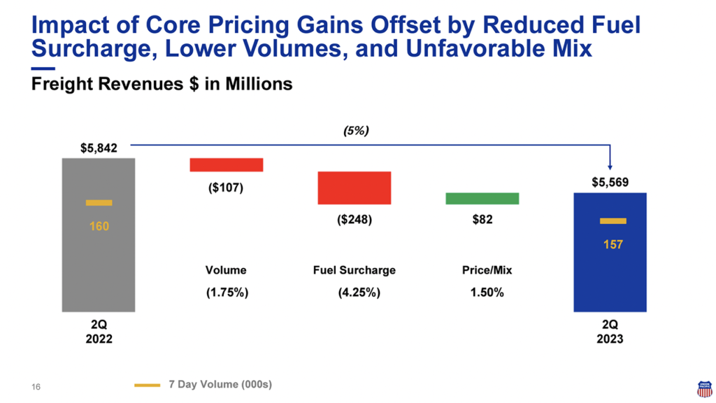 - Operating revenue was $5.96 billion, a 5% decrease from second-quarter 2022’s $6.27 billion, “driven by reduced fuel surcharge revenue, lower volumes, and an unfavorable business mix, partially offset by core pricing gains.”