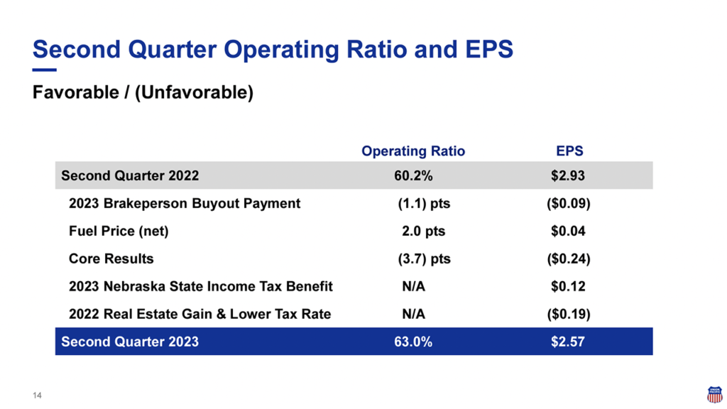 - Operating ratio was 63.0%, up 280 basis points. According to UP, this includes “an unfavorable 110 basis point impact from a one-time labor agreement payment and a 200 basis point benefit from falling fuel prices.”