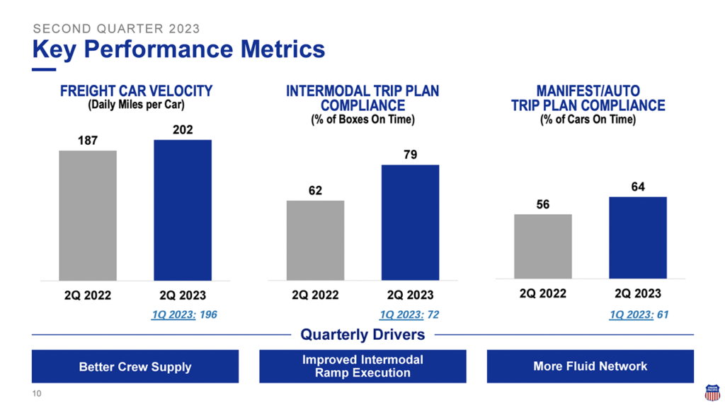 - UP said that its first-half reportable derailment rate improved 9% to 2.45 per million train miles compared with 2.68 for 2022.