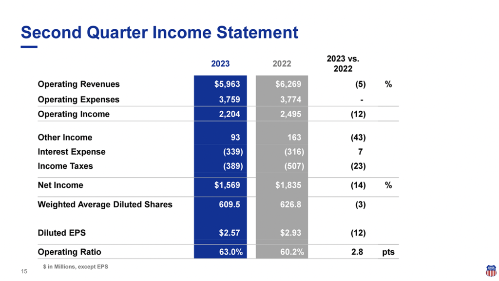 UP’s financial highlights for the three months ending June 30, 2023, include: