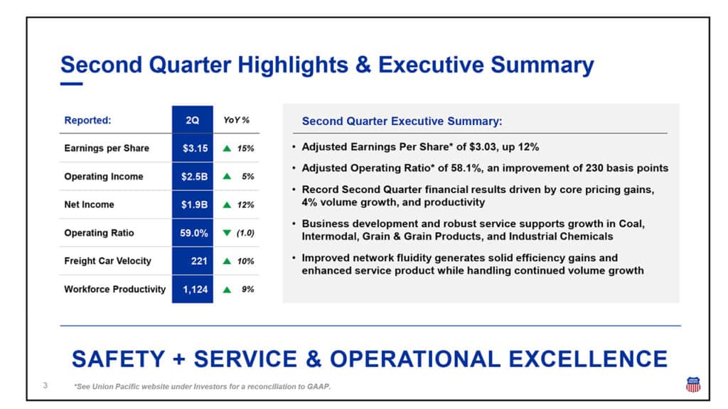 Compared to 2Q24, this year’s second quarter saw UP net income grow to $1.9 billion, or $3.15 per diluted share, from $1.7 billion, or $2.74 per diluted share. Operating revenue of $6.2 billion grew 2%, “driven by higher volume and solid core pricing gains partially offset by reduced fuel surcharge, business mix and lower other revenue. RTMs (revenue ton-miles) grew 8% to 107.6 million, from 100 million. Freight revenue excluding fuel surcharge grew 6%. UP’s reported operating ratio was 59.0%, a 100 basis points (BPS) improvement. The adjusted operating ratio was 58.1%, a 230 BPS improvement.