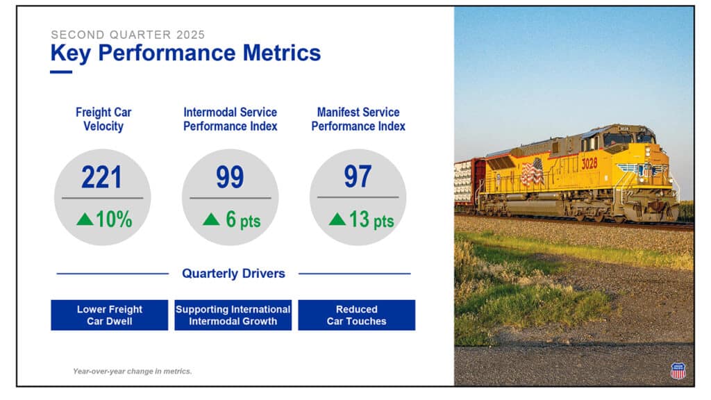UP noted its operating results show “continued improvement in safety, service, and operational excellence.” The railroad set a 2Q record for locomotive productivity and had a “best ever quarter” for workforce productivity and train length. The FRA reportable personal injury rate and reportable derailment rate both improved. Freight car velocity was 221 daily miles per car, a 10% improvement. Locomotive productivity was 141 gross ton-miles (GTMs) per horsepower day, a 5% improvement from 2Q24’s 134. Average maximum train length was 9,689 feet, a 2% increase. Workforce productivity improved 9% to 1,124 car-miles per employee.