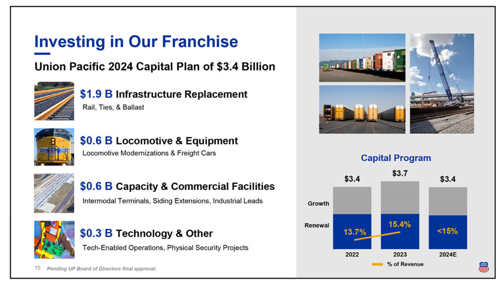 At its 4Q/Full-Year 2023 earnings presentation, Union Pacific said it would invest $3.4 billion in capital this year. On Feb. 21, UP confirmed its plan to “support safe operations, renew assets and grow with customers … to make the railroad safer and generate economic and supply chain activity across our 23-state footprint, boosting local, regional and national economy.”