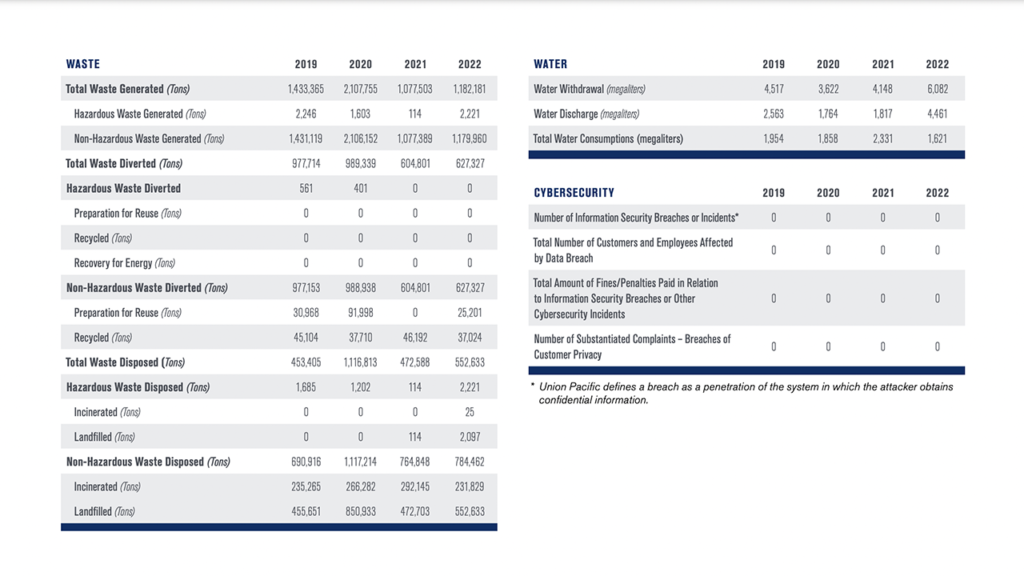 •UP reported taking two “major actions” in 2022 to demonstrate the importance of protecting biodiversity: First, it published a Biodiversity Statement “outlining our commitment to preserve the land our operations touch,” and second, it partnered with The Nature Conservancy to support three separate nature-based solutions projects based in Nebraska, California and Texas. Project goals include grassland and wetland restoration, groundwater recharge, threatened species habitat conservation, and community education.