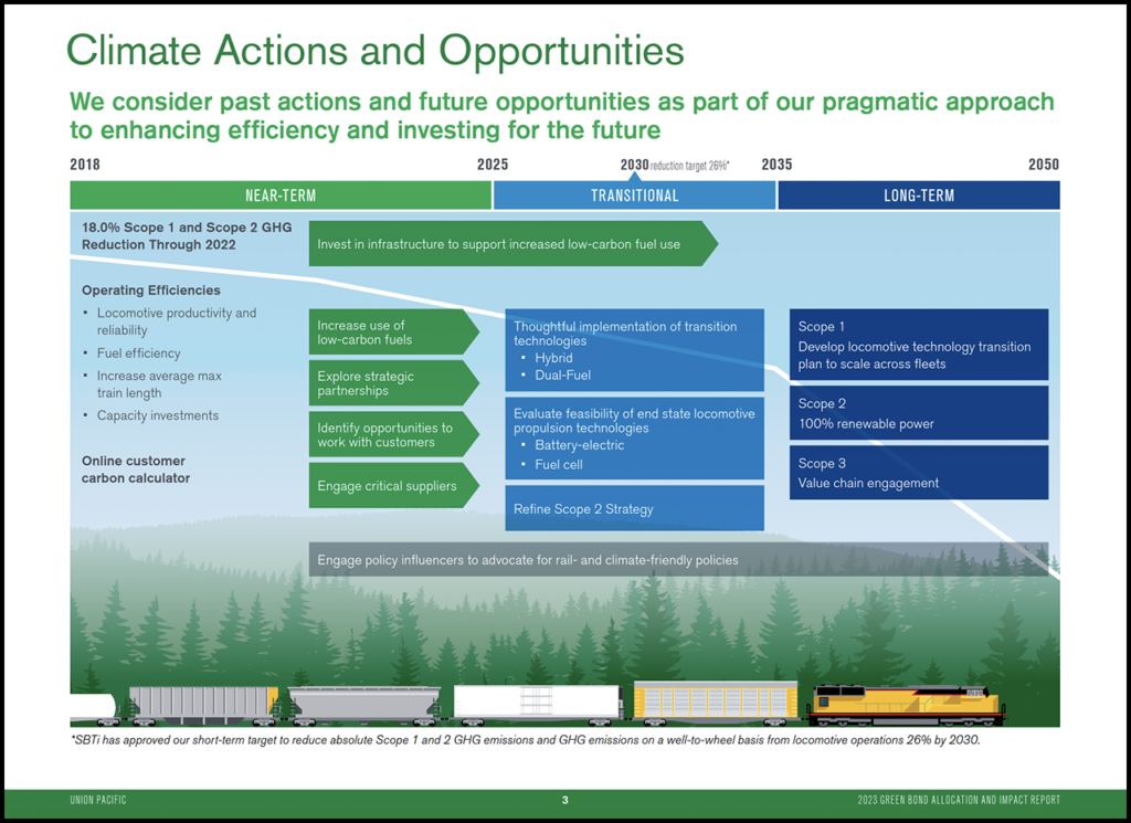 UP on Sept. 5 reported that 100% of the green-bond net proceeds were issued in September 2022 and used for projects supporting the railroad’s sustainability initiatives, consistent with its Green Financing Framework.