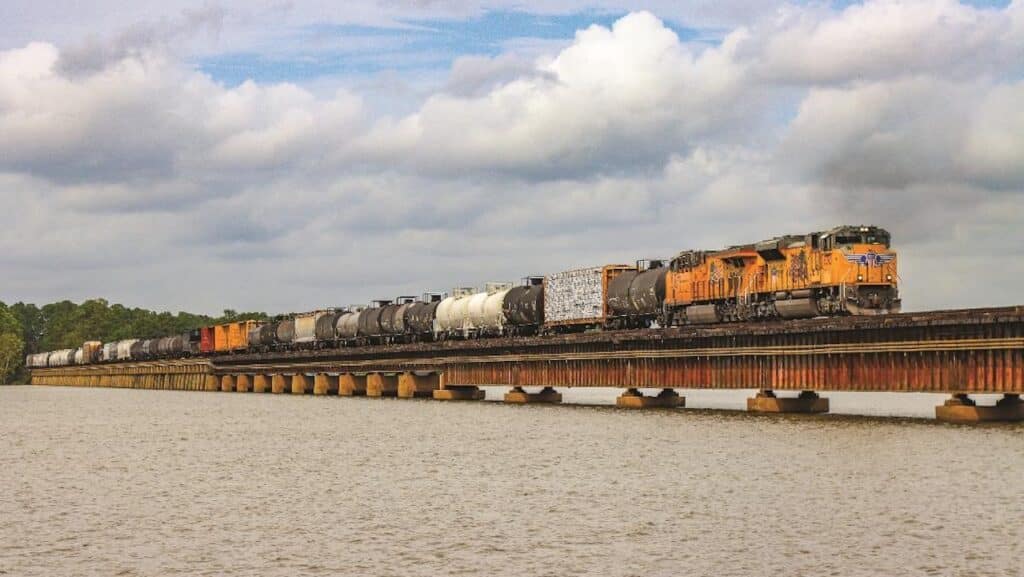 A Union Pacific manifest train crosses a Texas bridge. (UP)