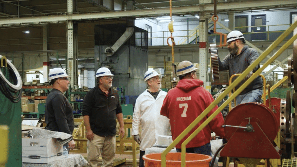Bryon Keim, Assistant Plant Superintendent, Huntington Heavy Repair at CSX (far left), is shown with members of the Mechanical team working on SD-70 rebuilds. (Screen Grab from CSX video)