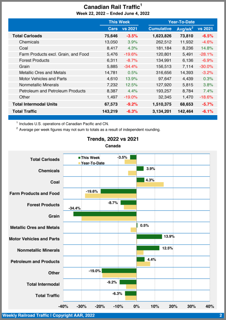 Canadian railroads reported 75,646 carloads for the week, a 3.5% decrease, and 67,573 intermodal units, a 9.2% drop compared with the same week in 2021. For the first 22 weeks of 2022, they reported cumulative rail traffic volume of 3,134,201 carloads, containers and trailers, down 6.1%.
