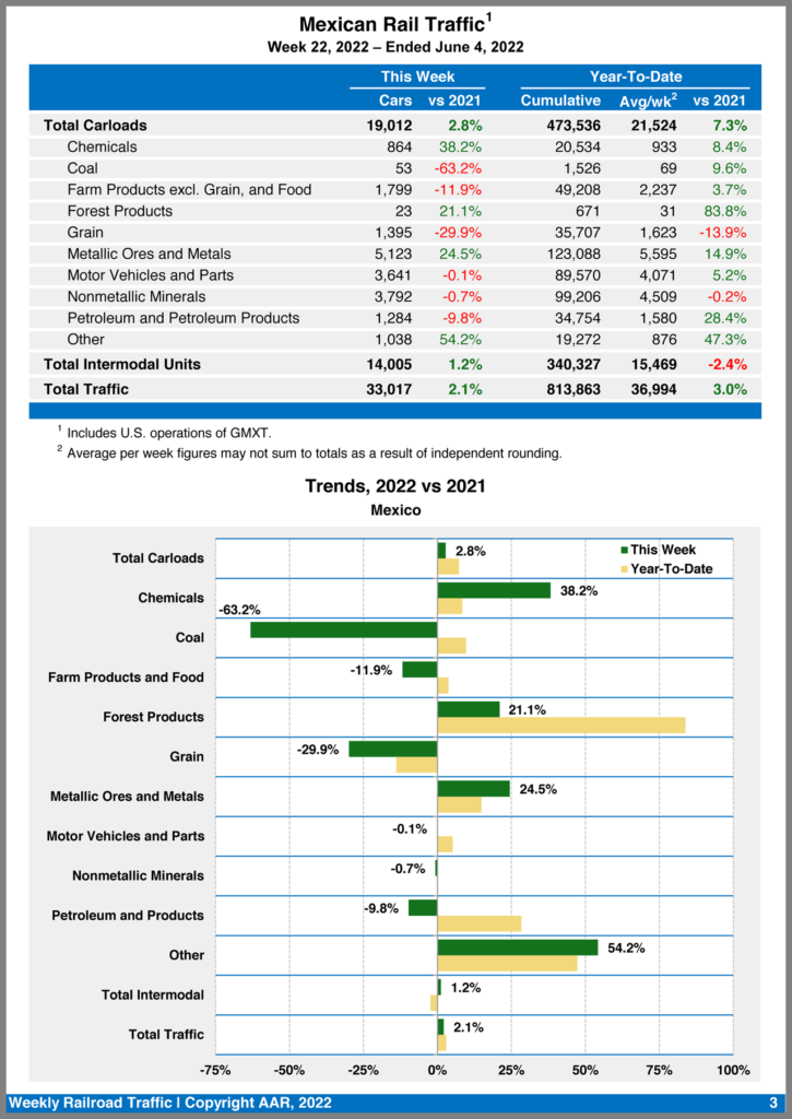Mexican railroads saw the only gains in week 22, reporting 19,012 carloads, an increase of 2.8% from the prior-year period, and 14,005 intermodal units, a rise of 1.2%. Their cumulative volume for the first 22 weeks of 2022 was 813,863 carloads and intermodal containers and trailers, up 3% from the same point in 2021.